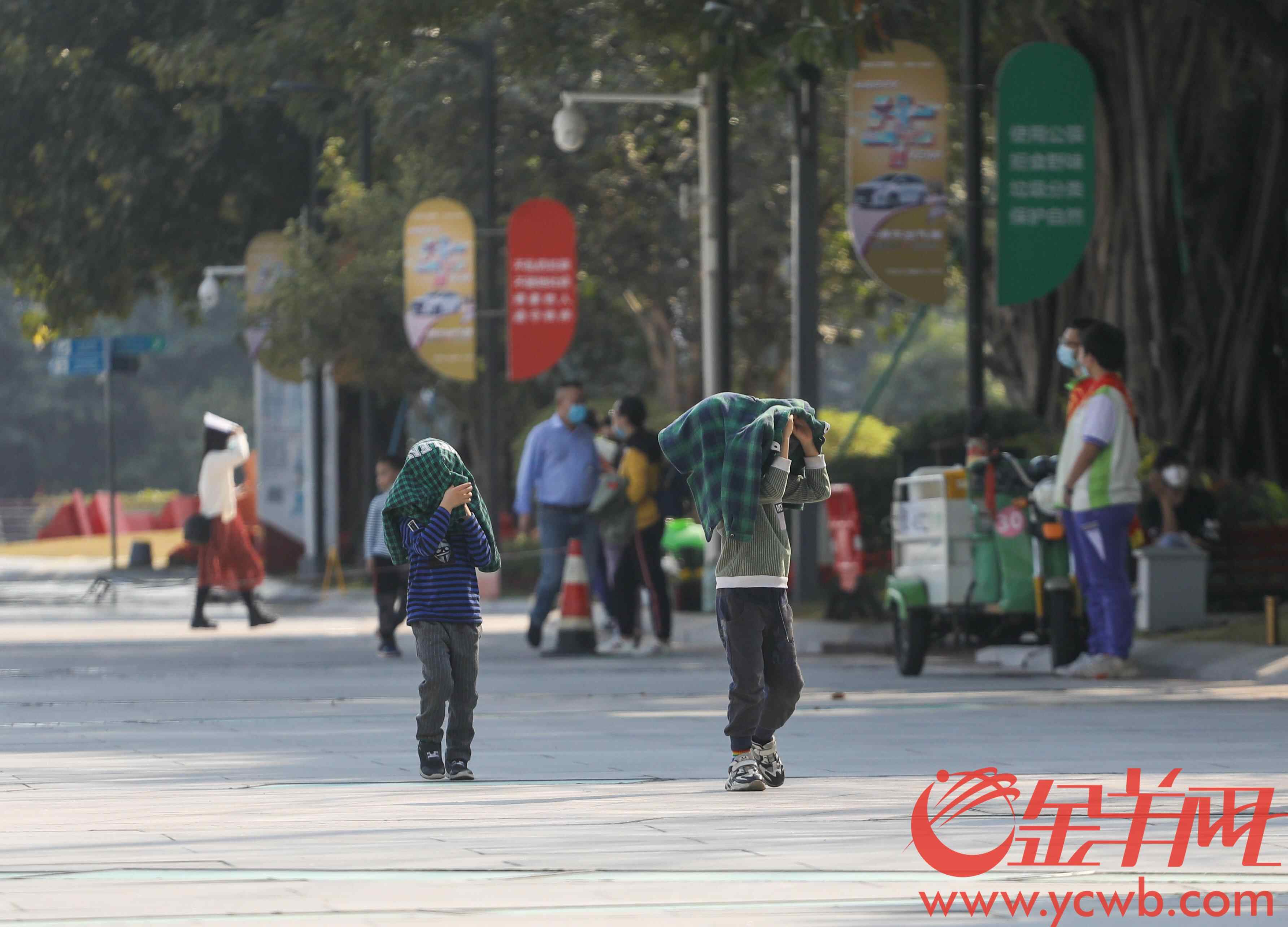 2月2日,广州花城广场,两位小朋友用外套遮挡阳光