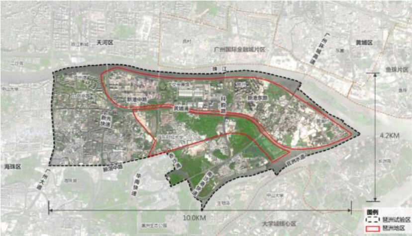 琶洲试验区面积约30平方公里,西起广州大道,东至珠江前航道与官洲水道交汇处,北至珠江前航道,南至新滘路一赤沙涌一官洲水道。其中琶洲地区14.9平方公里,包括琶洲岛与新滘路和规划海洲路围合而成的琶洲南部地区。2020年,琶洲试验区发展驶入快车道。2020年1~9月,琶洲试验区企业实现主营业务收入1828.72亿元。在琶洲试验区的带动下,2020年海珠区新一代信息技术服务业营收391.79亿元,同比增长43.7%。