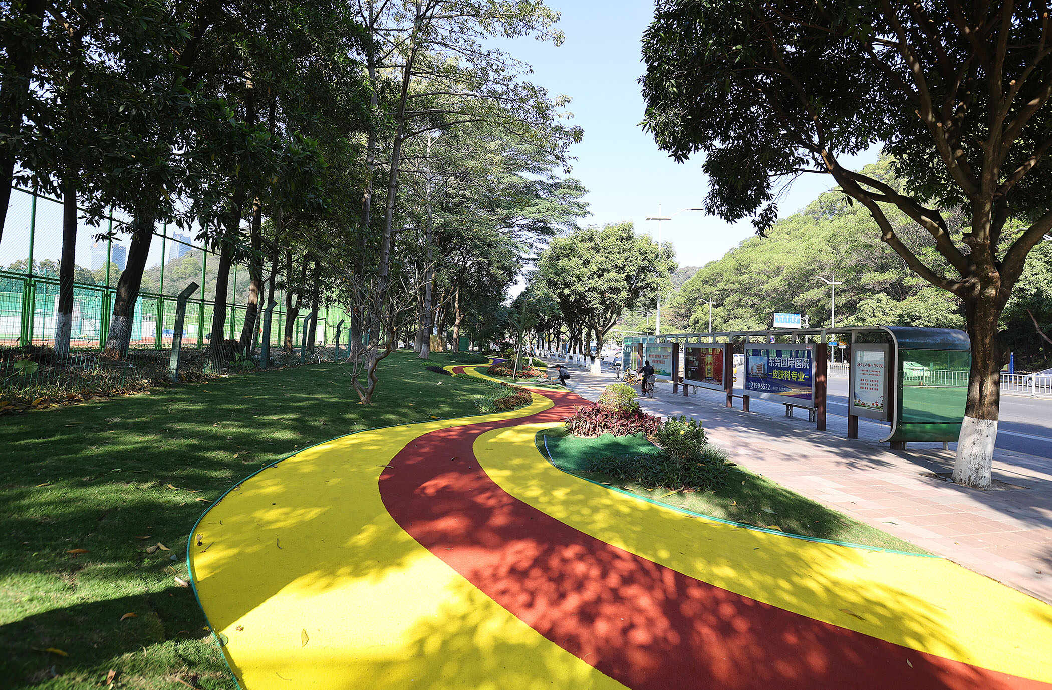 驱车从东城路御景大厦路口往虎英郊野公园方向行驶,两侧松竹叠翠,白石幽兰,红花金菊,沿路种有黄花风铃木、凤凰木、小叶紫薇等苗木,途经绿树掩映的翠峰路,来到东城体育公园北门,可以看到色彩绚丽的彩色跑道和小巧雅致的体育人文雕塑;体育公园的球场上,市民身影矫健、活力满满。一路而来,真是好一幅城市与生态、人与城市共生的连轴画卷。