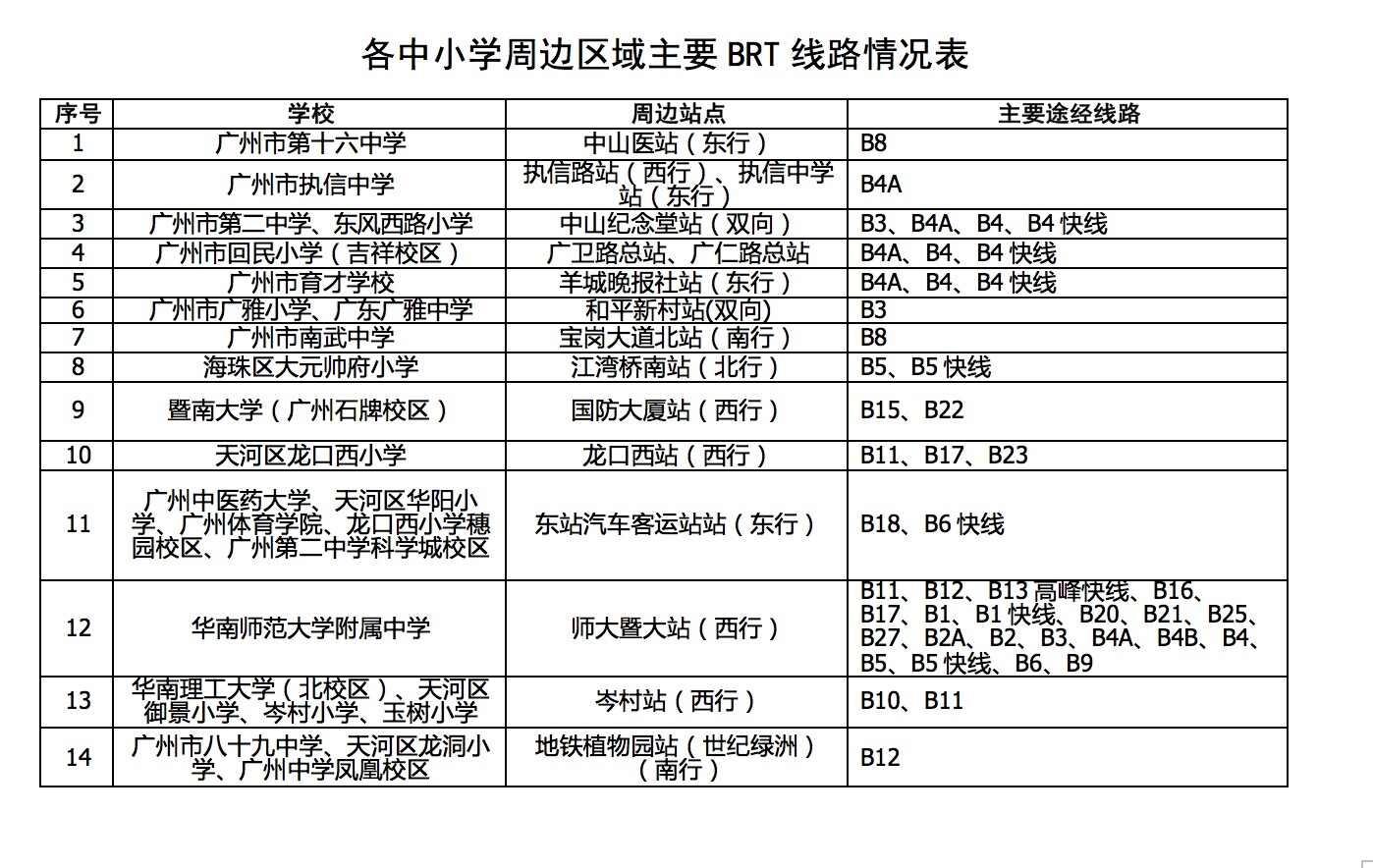 中小学周边区域主要BRT线路情况表 通讯员供图