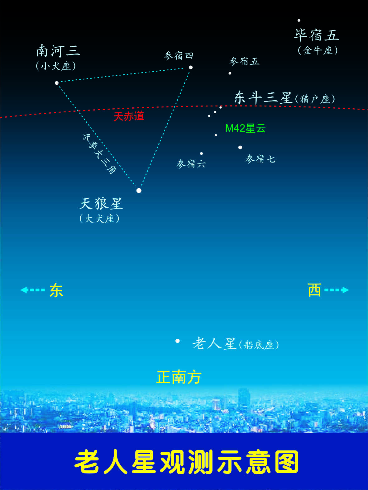 待夜幕降临后,在东南方可找到夜空中最明亮的恒星天狼星。在天狼星的南面偏西,可找到“老人星”。“老人星”呈青白色,光芒有闪烁。