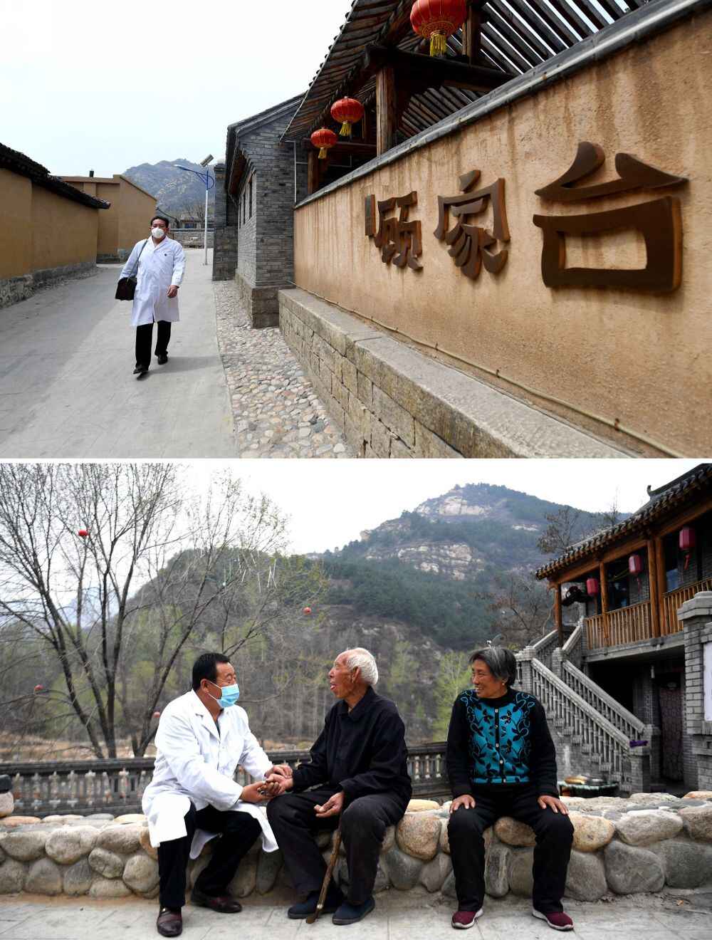 ↑近年来,阜平县积极推进健康扶贫,在基本医保、大病保险、医疗救助“三重保障线”基础上,财政投入资金,为困难群众提供防贫保险。同时,乡镇卫生院、村卫生室联合组队,定期上门问诊,保障困难群众享有基本医疗卫生服务。同时有效衔接低保政策与扶贫政策,切实兜住了困难群众的生活底线。上图:河北阜平县龙泉关镇顾家台村村医薄利走在出诊的路上(2020年4月15日摄);下图:在河北阜平县龙泉关镇骆驼湾村,村医霍建国为村民把脉(2020年4月15日摄)。