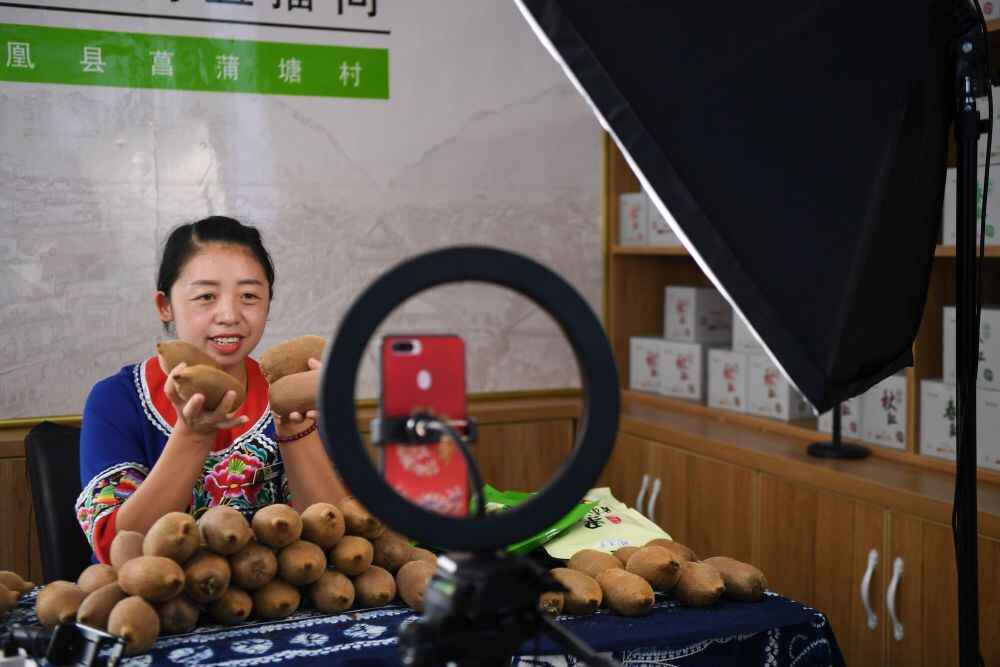 ↑湖南湘西凤凰县廖家桥镇菖蒲塘村以现代水果产业为抓手,打造果苗培育、水果种植、果品加工、嫁接服务全产业链;通过技术引进、电商推销等手段带动产业发展。2016年,菖蒲塘村脱贫出列。2019年,全村人均可支配收入达到23419元,贫困发生率降至0.6%。这是廖家桥镇菖蒲塘村电子商务中心的主播黄小琼在直播销售猕猴桃(2020年9月10日摄)。
