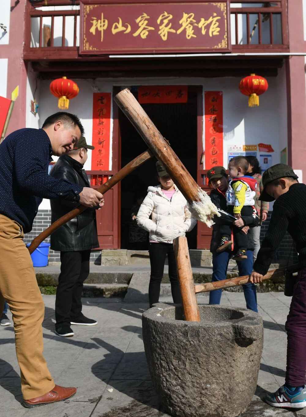 ↑到江西井冈山市神山村做客的外地人同村民一起打糍粑。神山村曾是井冈山最偏远的贫困村之一。如今这里变身中国美丽休闲乡村,全村开起了20多家农家乐,80%的村民参与乡村旅游,人均年收入从不足3000元提高到超过2万元。2017年2月,井冈山市正式宣布在全国率先脱贫摘帽,成为我国贫困退出机制建立后首个脱贫摘帽的贫困县(2018年2月16日摄)。