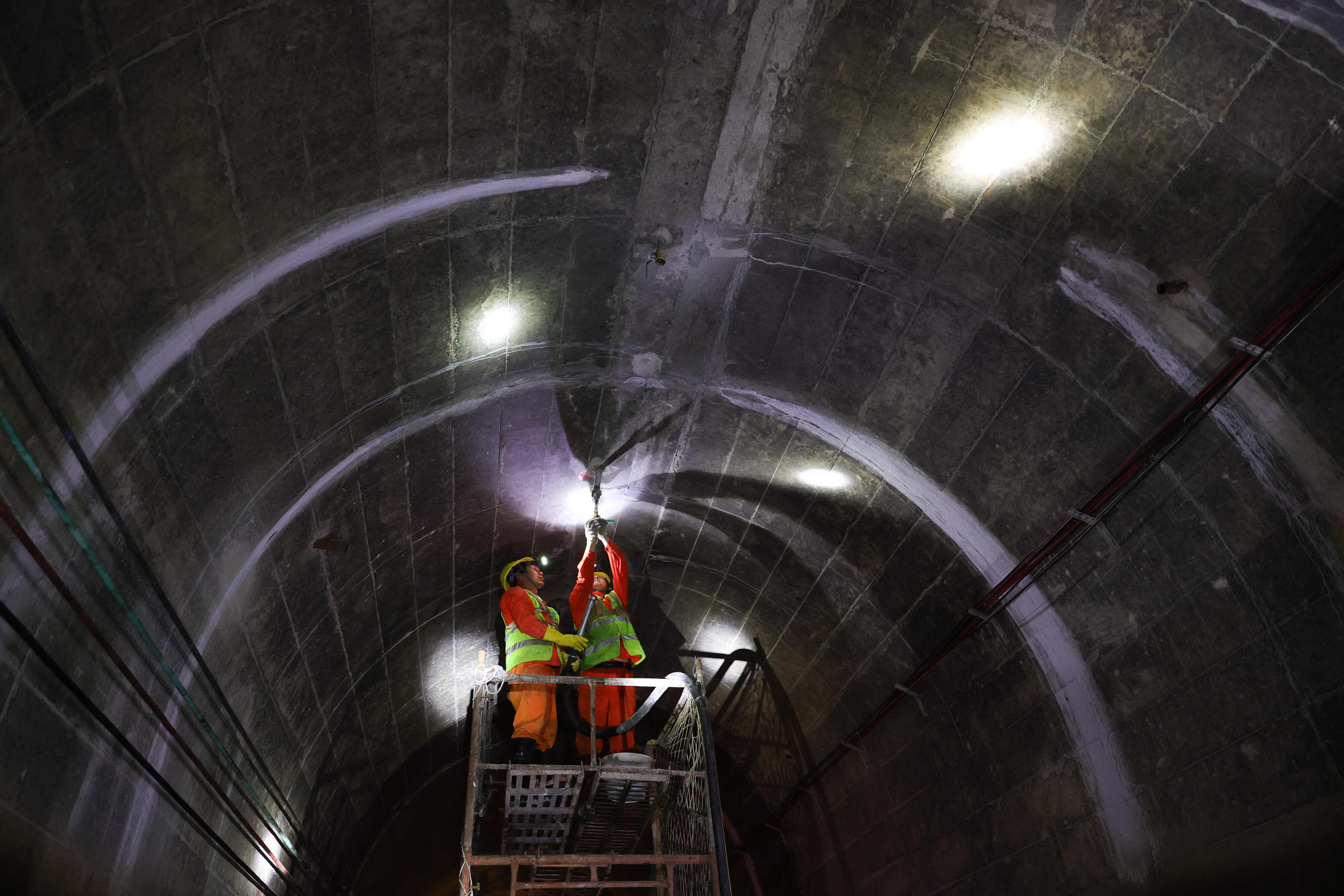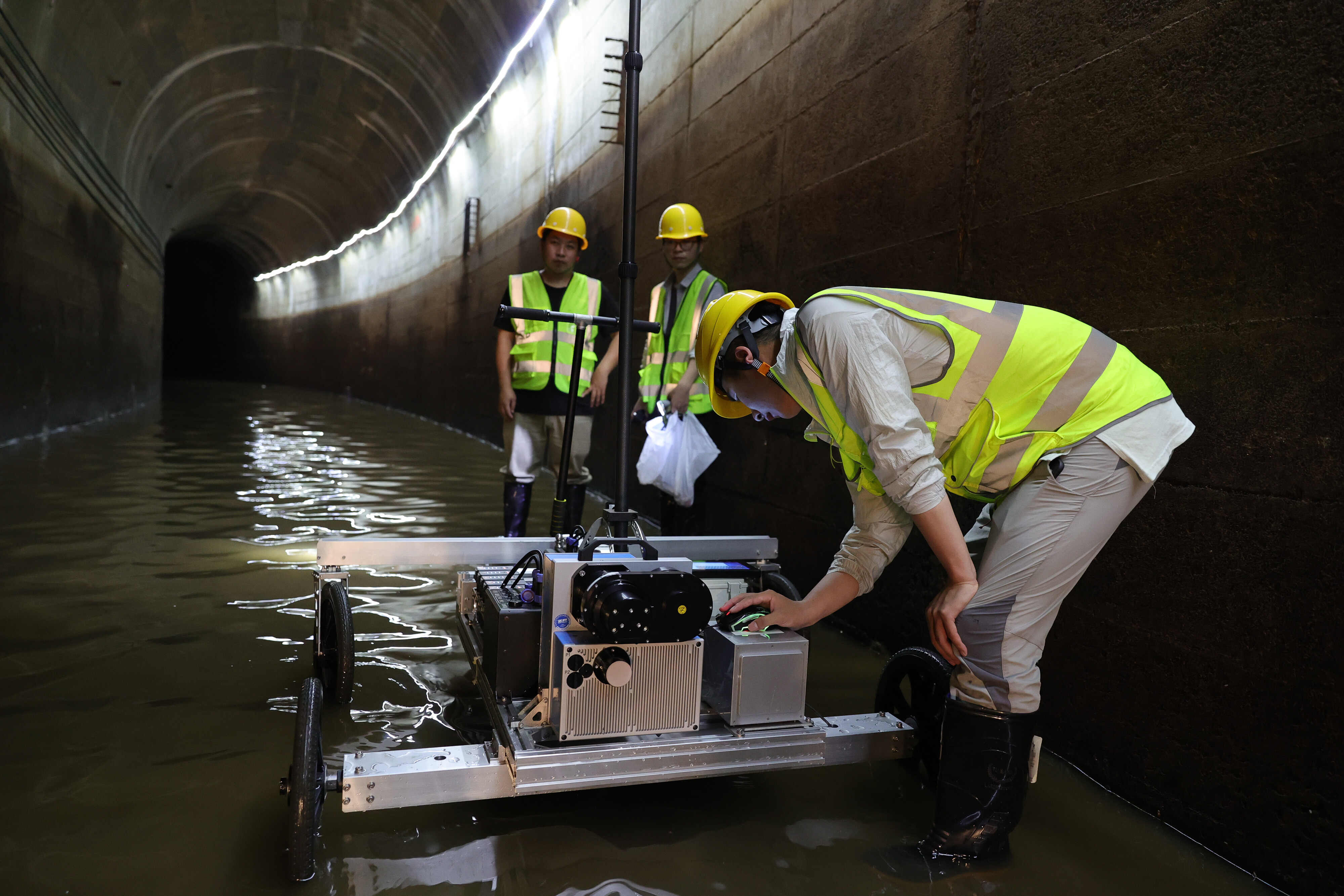抽完水之后,隧洞积水仍有约10厘米深,我们一路开着电瓶车巡线参观,光线忽明忽暗,工人们紧张忙碌,颇有美国大片感觉。此处除常规检修之外,还进行了加固施工,原因为顶部南科大医学院在建项目,为避免施工影响隧洞安全,给隧洞顶部加上钢圈钢板。