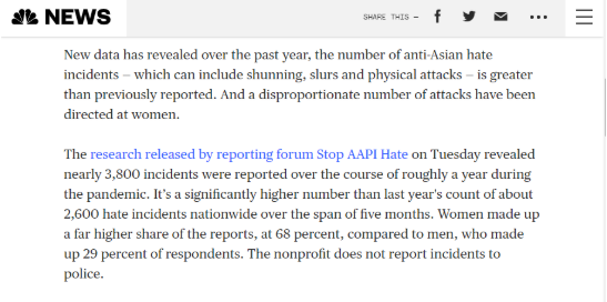 根据美国反亚太裔歧视的“停止仇恨亚裔及太平洋岛民”(Stop AAPI Hate)组织统计,自2020年3月19日至2021年2月28日将近一年的时间里,该组织至少收到了3795起针对亚裔的事件投诉,仅在过去两个月里,就有超过500起投诉。