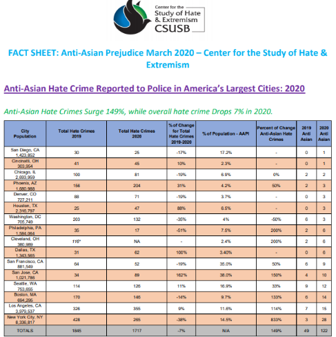 弱势的话语地位让亚裔社区成为种族主义泛滥的“重灾区”。加州大学圣贝纳迪诺分校“仇恨与极端主义研究中心”(Center for the Study of Hate and Extremism)的统计数据,2020年,美国整体仇恨犯罪案件较2019年下降了7%,然而针对亚裔的仇恨犯罪却激增149%。