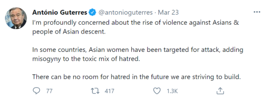 ▲古特雷斯在推特上呼吁抵制种族歧视