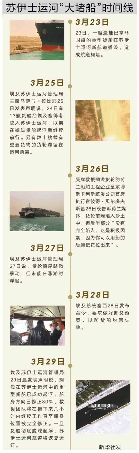 从23日到29日,这艘重型货轮已经把苏伊士运河整整堵住了一周。运河两侧,等待通行的船只目前已接近400艘。作为世界最重要的海运通道之一,苏伊士运河堵塞让全球供应链“如鲠在喉”。搁浅、堵塞带来的停航危机为全球贸易通道安全等问题留下教训和警示。