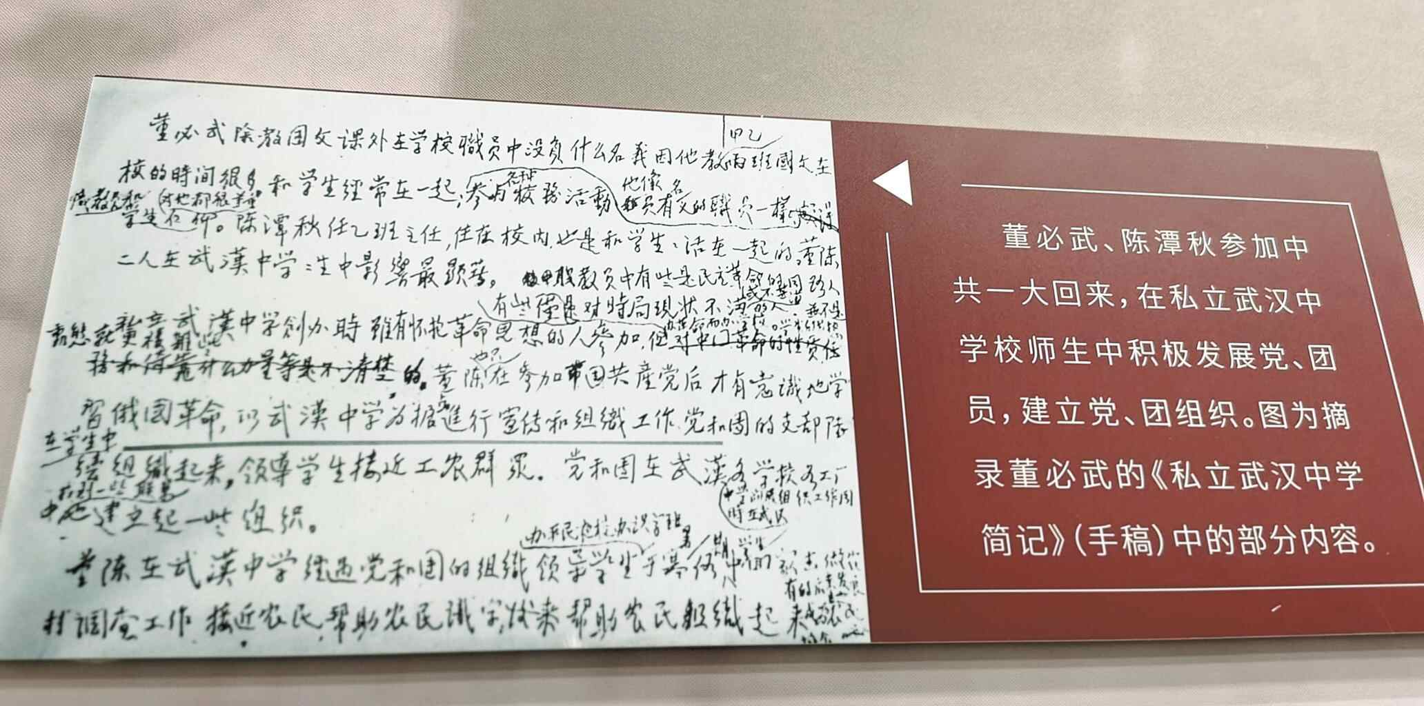 武汉中学校史馆里,董必武回忆办学经历的手稿。(湖北日报全媒记者 周志兵 摄)