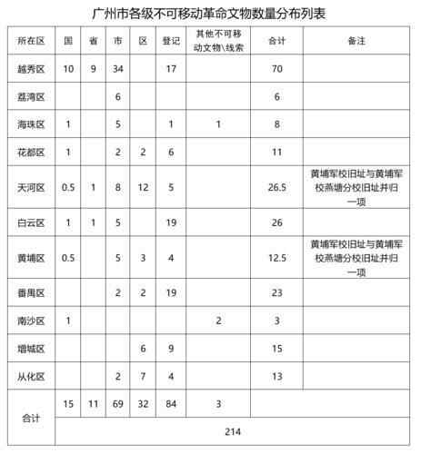 值得注意的是,广州11个区均有不可移动革命文物,且绝大部分区的数量在两位数以上,让更多群众能就近感受红色文化的熏陶。