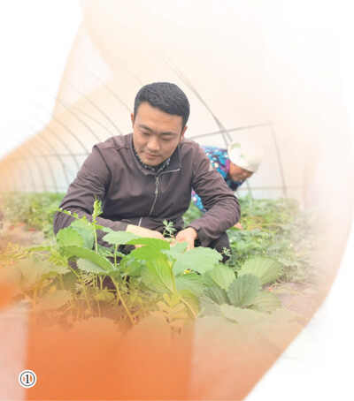 图①:杨伟在草莓大棚里掰叶。人民日报记者 游 仪摄