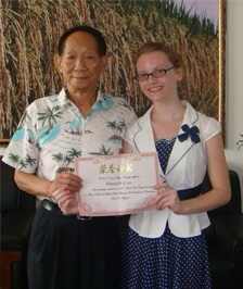 Yuan Longping poses with Hannah Cox, a student on Borlaug-Ruan International Internships in 2007. [File photo provided by World Food Prize Foundation]