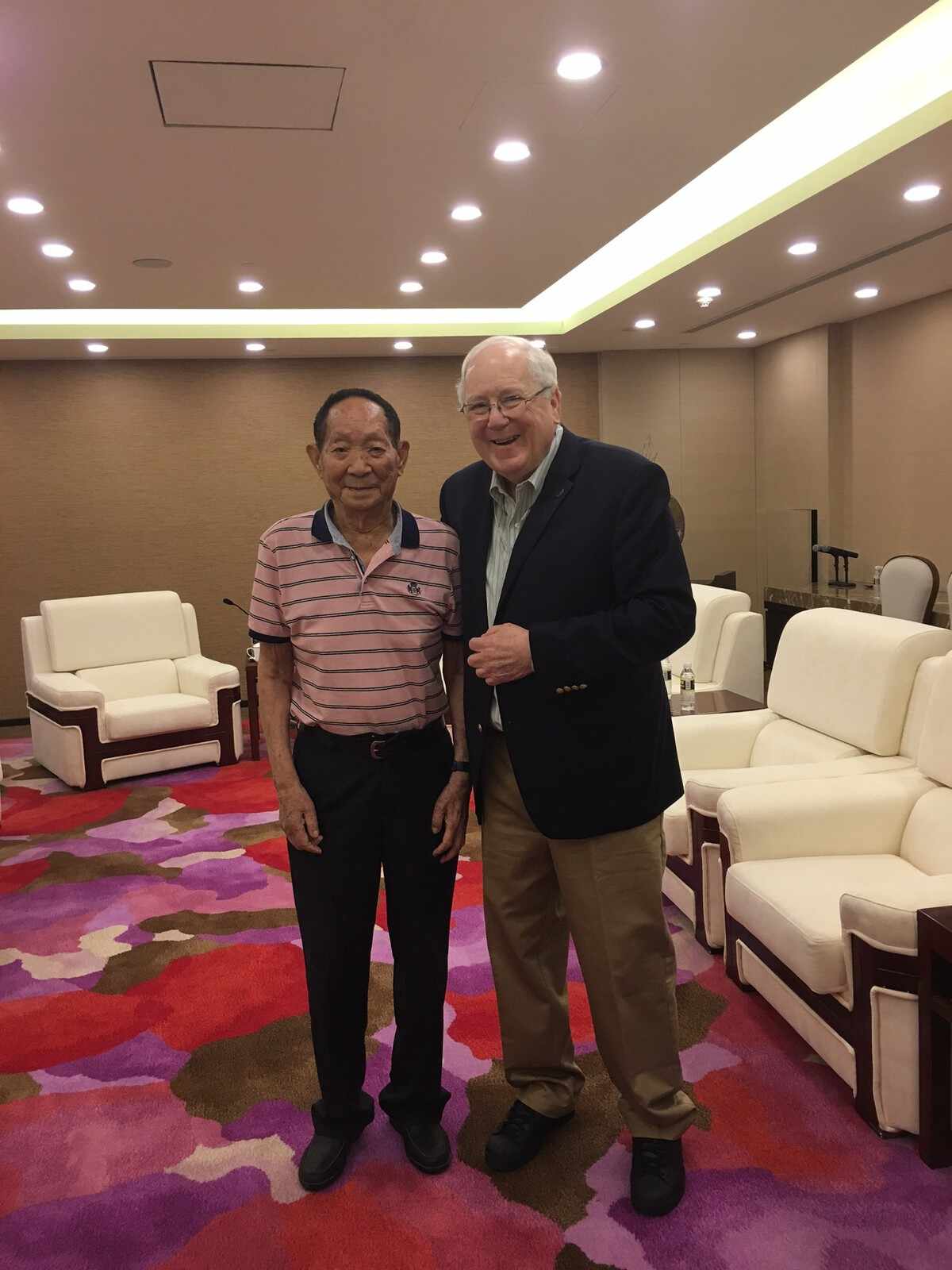Kenneth M. Quinn, then president of the World Food Prize, meets with Yuan Longping in Sanya, Hainan province in April 2019. [Photo provided to China Daily]