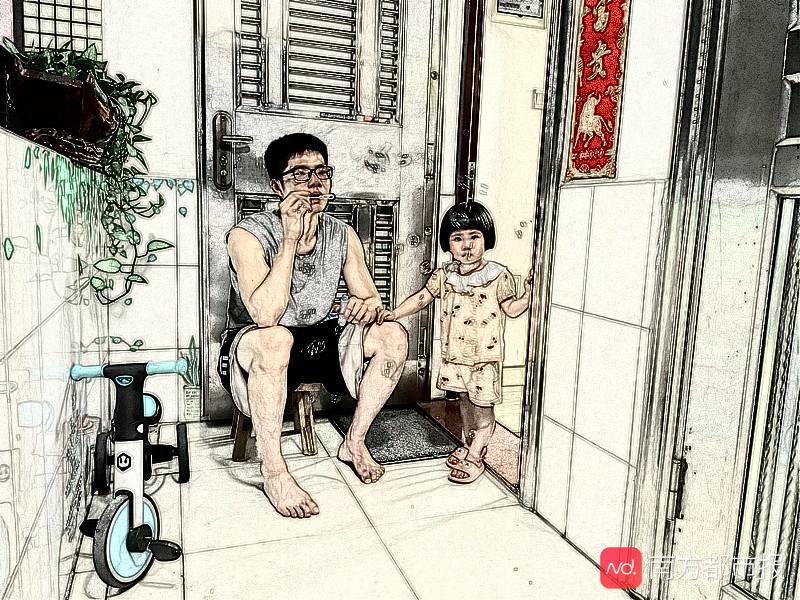 回到芳和花园25楼这一层,陈明搬了小板凳坐在家门口,这是女儿出生以来,他第一次在她身边陪伴了这么久。他打开一罐泡泡吹起,走道飘起了七彩泡泡,2岁的瑶瑶好奇地望着。旁边一户人家门前,小女孩画了一张画送给上门的三人小组,引发成员们在微信群里热烈讨论。