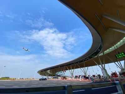 机场收费站占地总面积为11500平方米,主体跨度约150米,最高点相对高度为15.8米,建筑整体为近似中心对称的S型。建筑结构为钢结构,总用钢量约2620吨,单跨最大长度47米。幕墙施工面积约22500平方米,泛光安装灯具7891套,垂直绿化约2540平方米。