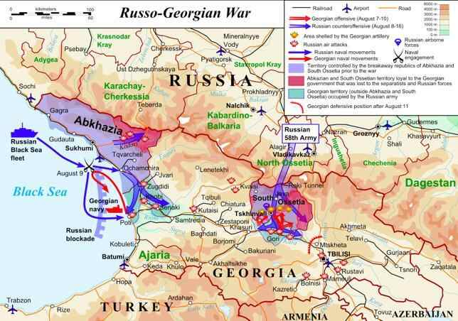 2008年8月1日,格鲁吉亚和南奥塞梯开始正式交火。8月8日,当世界的目光还在北京奥运会开幕式的时候,格鲁吉亚政府开始向南奥塞梯地区发动大规模进攻。这让在北京参加奥运会开幕式的普京有点儿坐不住了,次日便匆匆离开飞往前线。俄罗斯军队以格鲁吉亚屠杀俄罗斯人为由,开始进入南奥塞梯地区及阿布哈兹地区,与格鲁吉亚军队展开激烈交锋。战争持续了五天,俄军在几日内迅速取得了南奥塞梯首府茨欣瓦利以及阿布哈兹首府苏呼米的控制权,并且开始向格鲁吉亚首都第比利斯进军。
