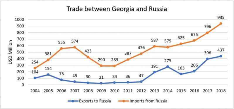 2012年起,格鲁吉亚对俄罗斯公民实行免签政策。此后,随着一些政府支持的民间往来增多,双边经贸关系再度提升,其中格鲁吉亚从俄罗斯进口额是2005年冲突前的三倍,出口额近乎是2005年的两倍(如下图)。