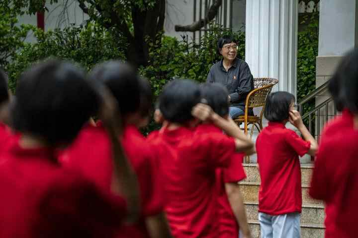 张桂梅观看新生学习课间操(2021年8月24日摄)。新华社记者江文耀摄