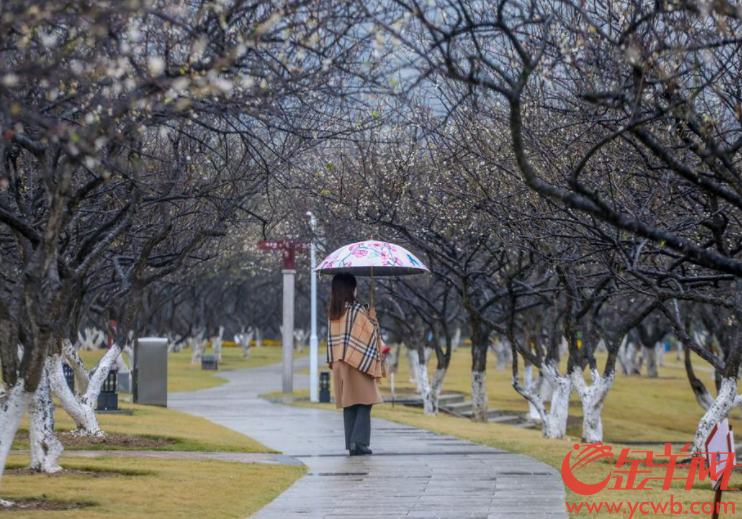 2021年12月20日,台风“雷伊”为广州带来降雨,游客在萝岗香雪公园欣赏“雨中香雪”梁怿韬 摄