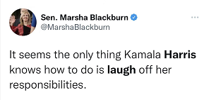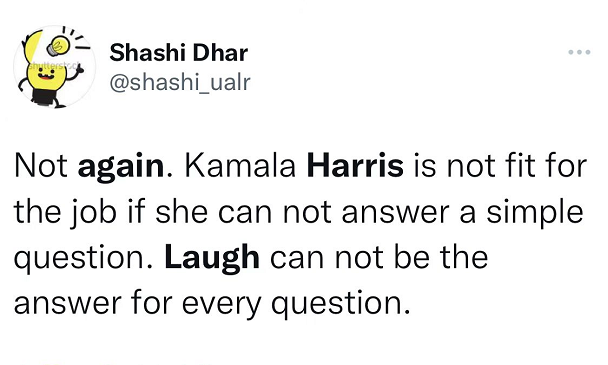 “如果哈里斯不能回答一个简单的问题,她就不适合这份工作。笑并不能解决问题。”