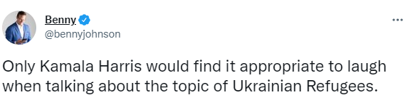 美国保守派人士本尼·约翰逊(Benny Johnson)在社交媒体发文称:“只有卡玛拉·哈里斯才会觉得在谈论乌克兰难民话题时大笑没问题。”