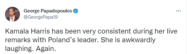 美国前总统特朗普的前竞选助手乔治·帕帕佐普洛斯在社交媒体上表示,“卡玛拉·哈里斯在与波兰领导人现场讲话中的表现一如既往。她又笑了。”