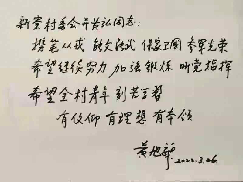 今年春季,黄弘成为揭阳建市以来学历最高的应征入伍青年,新寮村的族人们很是骄傲,新寮村委会随即写信向黄旭华院士报告这个好消息。年已近百的黄旭华院士获悉后倍感欣慰,马上亲笔给新寮村委会和黄弘回信。