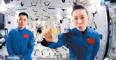 3月23日,航天员王亚平(女)与叶光富在演示太空水油分离实验。央视视频截图