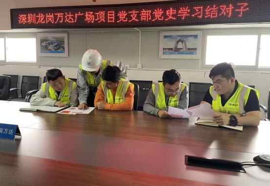 2021年,南方分公司党总支根据项目流动党员及劳务工友党员数量较多的情况,启动结对子学党史帮扶活动,为项目支部党员和流动党员架起“连心桥”,提供互学互促平台,基层党支部迅速覆盖,学习落实党总支部署,迈出“学+创”第一步。龙岗万达广场项目党支部的流动党员与支部党员基本呈1:1比例,项目党支部根据这一特点,形成一对一的固定学习伙伴,并创造性地开展党史故事分享会,在提高党史学习质量及热情的同时,促进了项目党员间的交流及凝聚,因势制宜地根据“学+创”模式走好第二步,提升项目党支部引领能力。