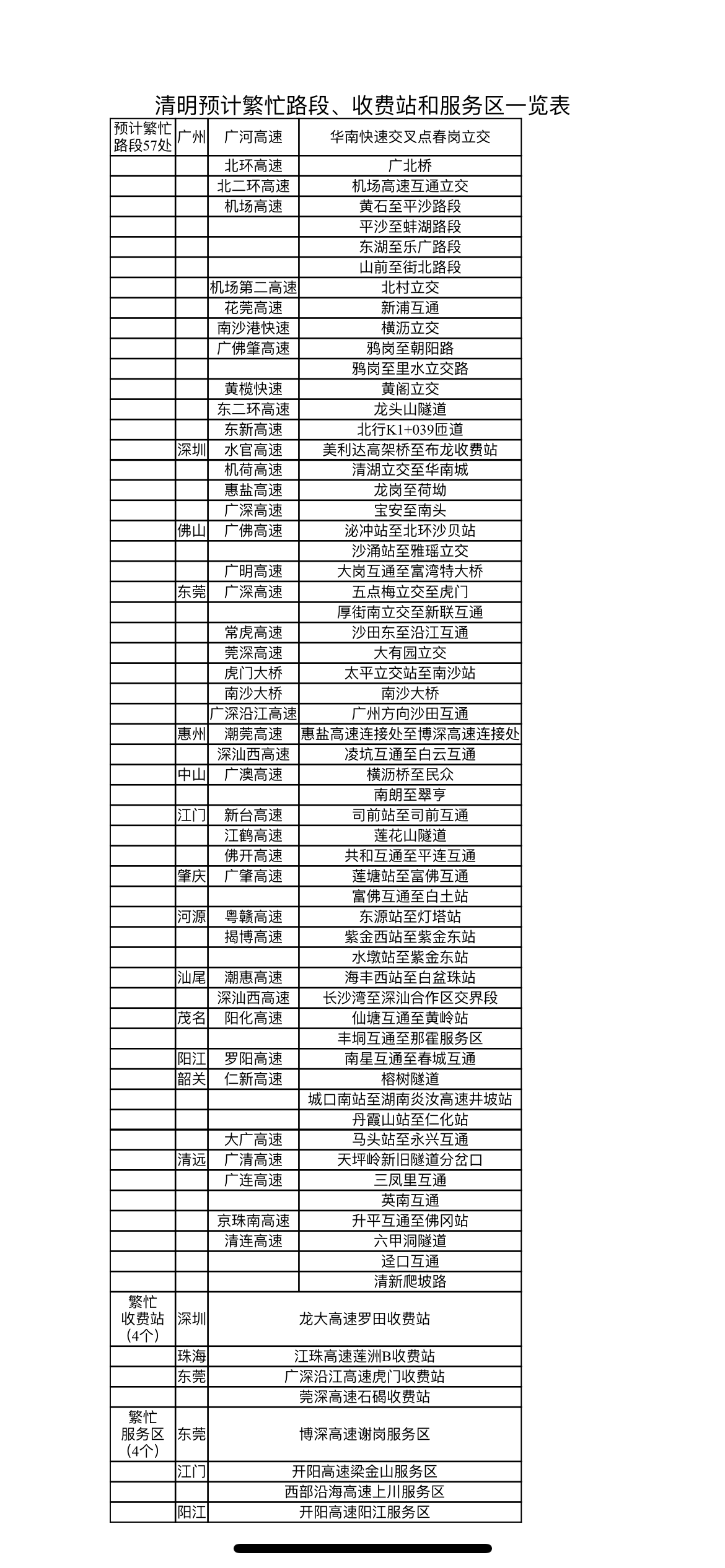 今年清明,预计主要拥堵路段主要集中在广河高速、北环高速、北二环高速、机场高速、花莞高速、广佛肇高速等57处,预计车流较大的服务区是博深高速谢岗服务区、开阳高速梁金山服务区、西部沿海高速上川服务区、开阳高速阳江服务区等4个;预计车流较大的收费站是龙大高速罗田收费站、江珠高速莲洲B收费站、广深沿江高速虎门收费站、莞深高速石碣收费站等4个。