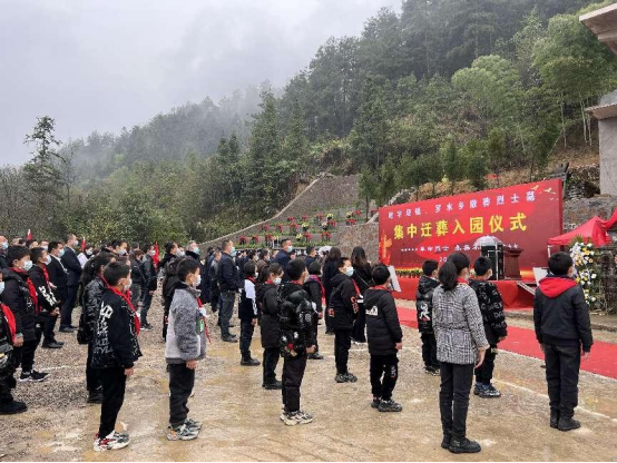 上午9点28分,随着低沉的思念曲响起,由18位特警组成的礼兵整齐列队,手捧18名烈士骨灰盒缓缓步入陵园,庄严的走向安葬区,将骨灰盒小心翼翼的安葬于墓穴中,以告慰英烈忠魂。现场人员神情庄重,向安葬的革命先烈集体默哀,随后,来自张家界市、永定区有关单位和少先队员、烈士家属及社会各界群众一一上前为烈士献花,以文明祭扫的方式表达对革命先烈的崇敬之情,用真心缅怀革命先烈,传承红色基因,赓续红色血脉。