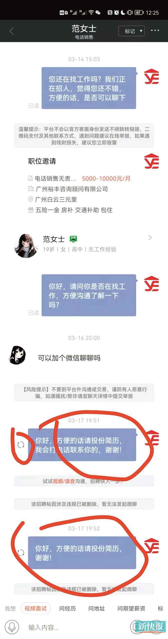 3月14日下午,郑小姐向一名求职者发出职位邀请,向求职者发出“您好,请问你是否在找工作,方便沟通了解一下吗?”3月16日晚8时对方回了一句“可以加个微信聊聊吗?”3月17日郑小姐回复“你好,方便的话请投份简历,我会打电话联系你的。谢谢!”郑小姐发送的信息并没有发送成功,郑小姐再发出“你好,方便的话请投份简历,谢谢。”信息仍旧没有发送成功。郑小姐联系58同城客服工作人员,工作人员告诉郑小姐她的账号已经被冻结。