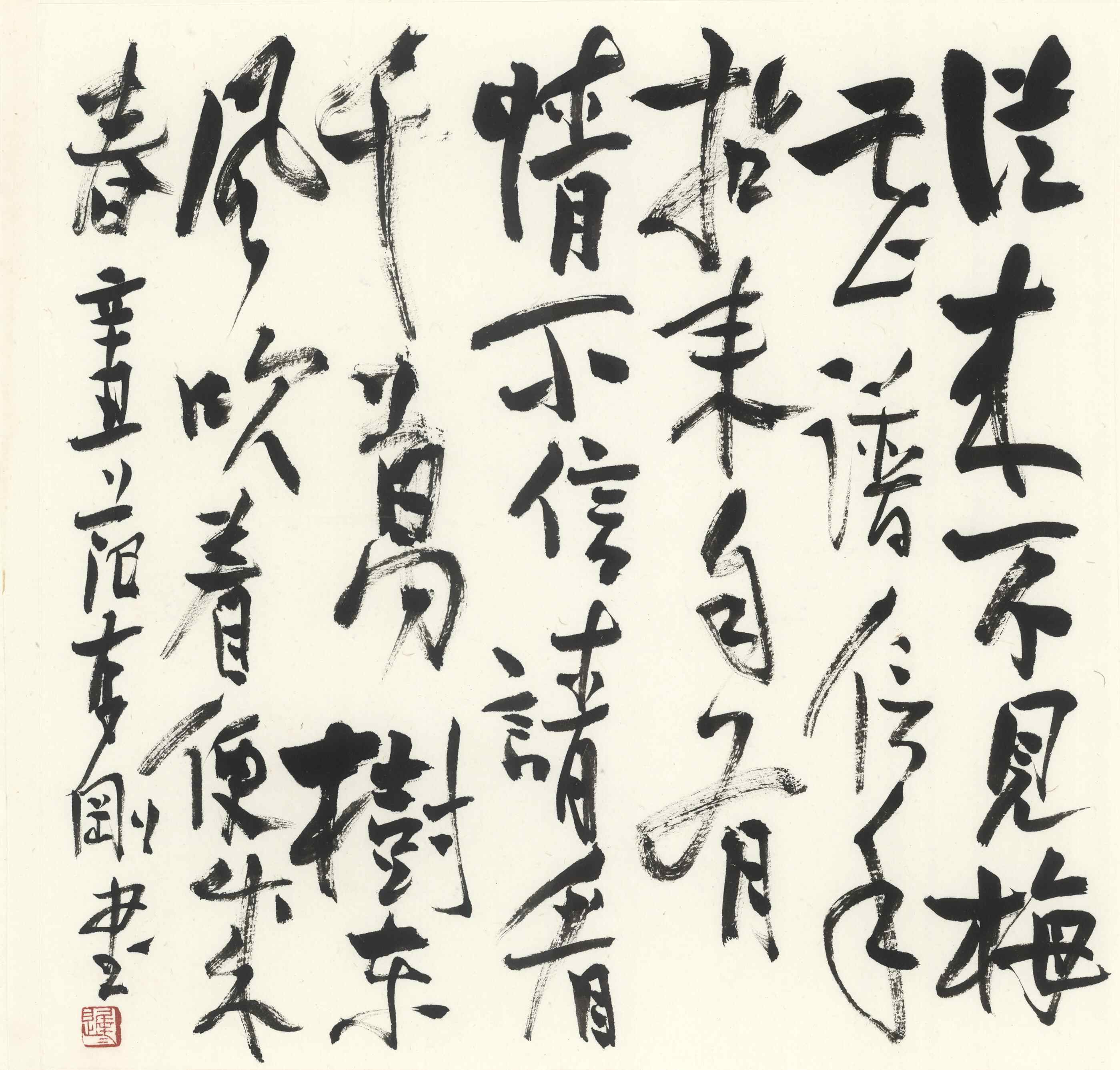 大写意要的是万法归一的精粹提炼,给读者以由一化万的丰厚、醇郁的寓于目而驻于心的悠长美感。缺失下笔前的千锤百炼,缺乏挥运中的笔精墨妙,决无真正的大写意,其结局难免“废画三千”。