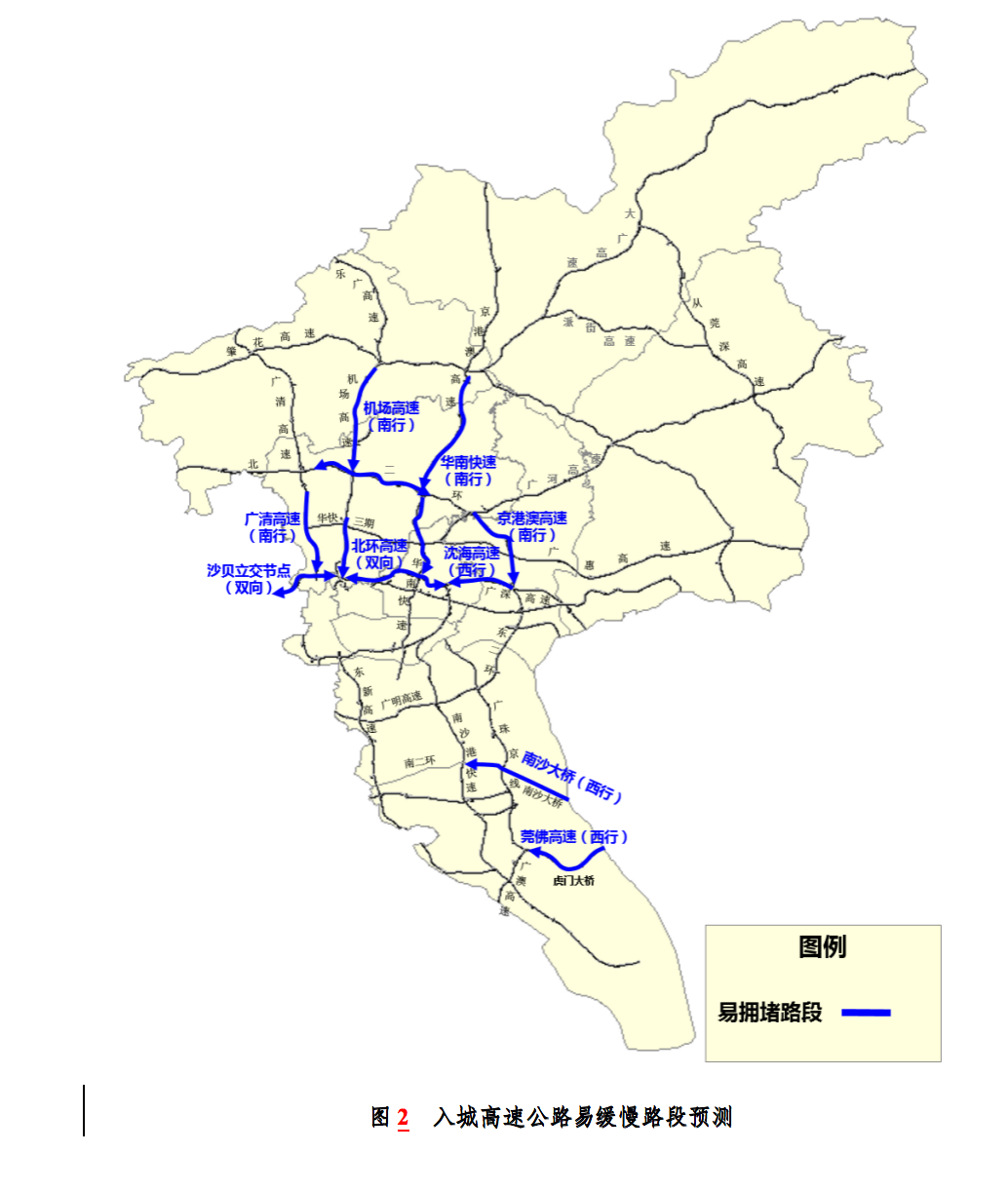 届时,市区收费站、互通立交等节点容易出现缓行情况。如机场高速(三元里-蚌湖立交段)、华南快速路(春岗立交-太和立交段)、大广高速(石岭互通)、广河高速(春岗立交-八斗立交段)、北三环(机场北立交-杨荷立交)、乐广高速(花山互通立交-花山隧道段)、广清高速(广清立交-朝阳立交段)、沈海高速(蚌湖立交-和顺立交段)、南二环(鱼窝头立交-张松立交段)等瓶颈路段。