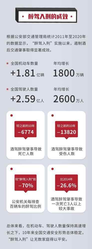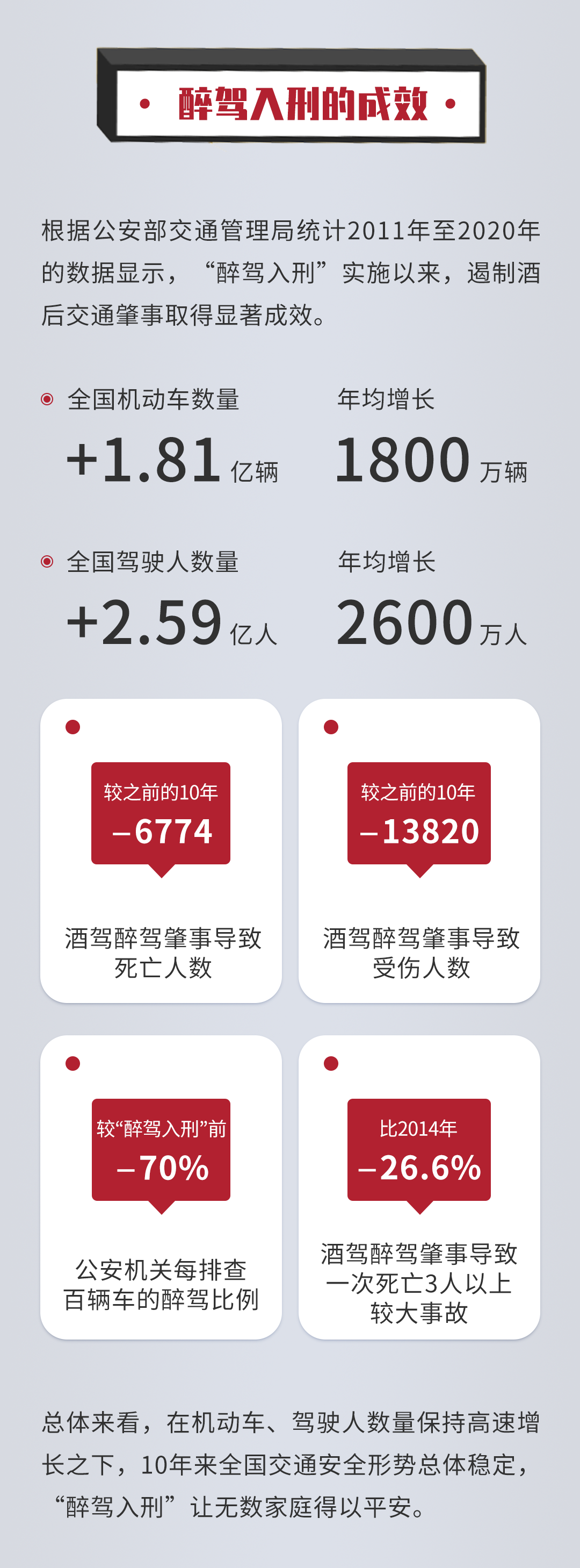 根据公安部交通管理局统计2011年至2020年的数据显示,“醉驾入刑后” 实施以后,遏制酒后交通肇事取得了显著成效。其中,酒驾醉驾肇事导致死亡人数较之前10年减少6774人,酒驾醉驾肇事导致的受伤人数较之前10年减少13830人,公安机关每排查百辆车的醉驾比例较“醉驾入刑”前减少70%。
