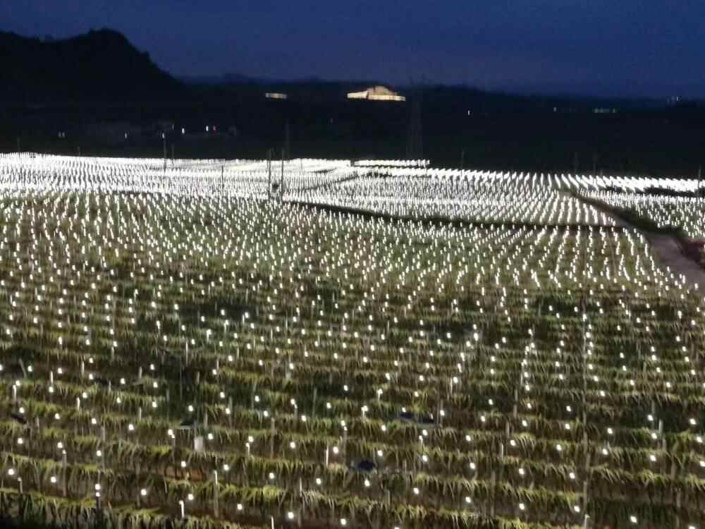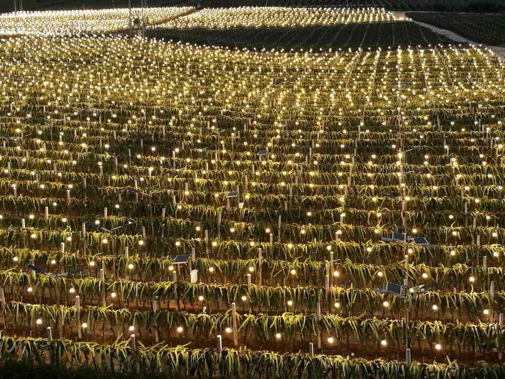 当地许多火龙果种植基地通过引入灯光补给系统,模拟不同时段的太阳光波,给生长期的火龙果进行补光,促进光合作用,在延长挂果期的同时,使火龙果的产量和品质得到提高。“浪漫果园”就是灯光补给系统的一个副产品。