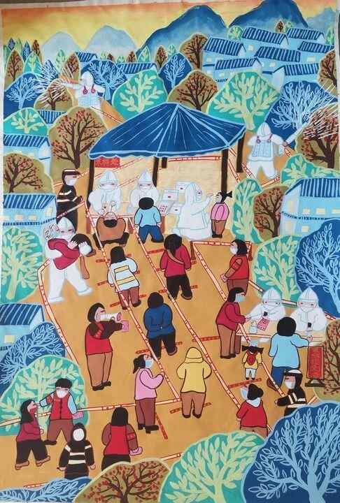 “大白”、喇叭、村道上排队做核酸的村民……中国青州农民画画院里,与泥土打了半辈子交道的王化芹在认真画着又一幅作品。