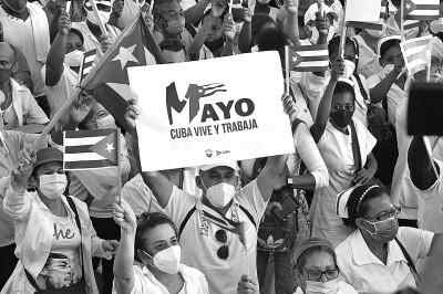 古巴多地5月1日举行“五一”国际劳动节集会游行,上百万民众走上街头,反对美国对古封锁,表达爱国情感,并向古巴医疗工作者和科研人员致敬。图为5月1日,古巴民众在哈瓦那参加“五一”国际劳动节集会游行。新华社发