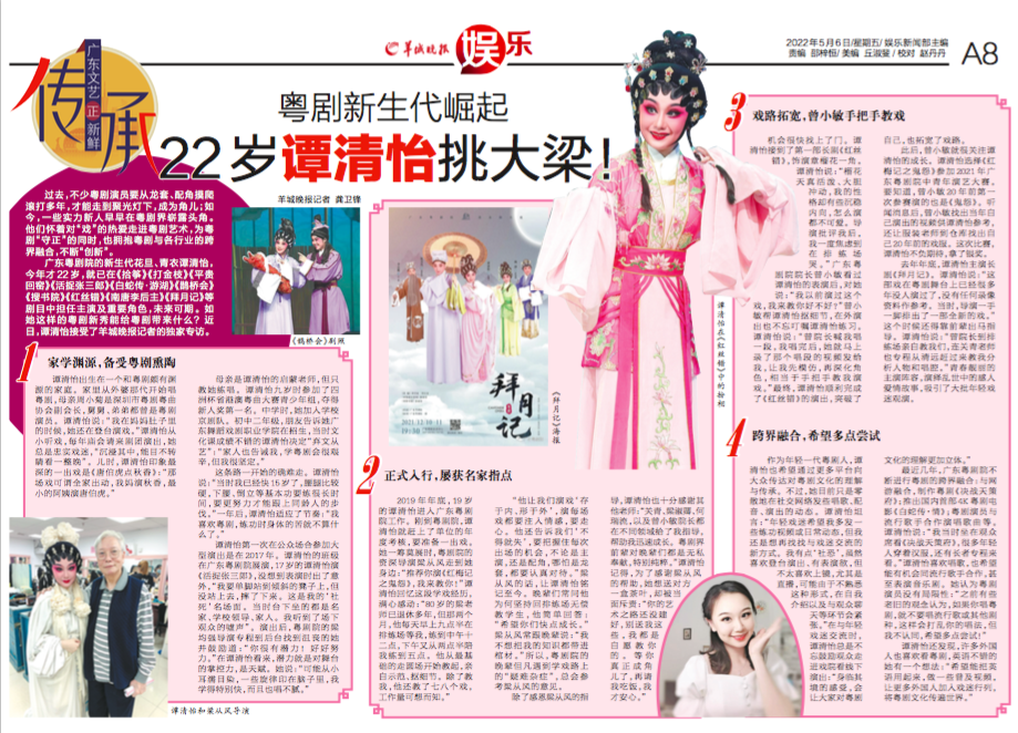 广东粤剧院的新生代花旦、青衣谭清怡,今年才22岁,就已在《拾筝》《打金枝》《平贵回窑》《活捉张三郎》《白蛇传·游湖》《鹊桥会》《搜书院》《红丝错》《南唐李后主》《拜月记》等剧目中担任主演及重要角色,未来可期。如她这样的粤剧新秀能给粤剧带来什么?近日,谭清怡接受了羊城晚报记者的独家专访。