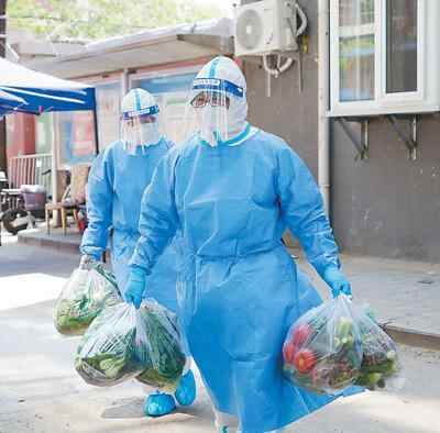 北京市朝阳区八里庄街道红庙北里社区,社区工作人员为封控和管控区的居民分发蔬菜等生活物资。 新华社记者 鞠焕宗摄