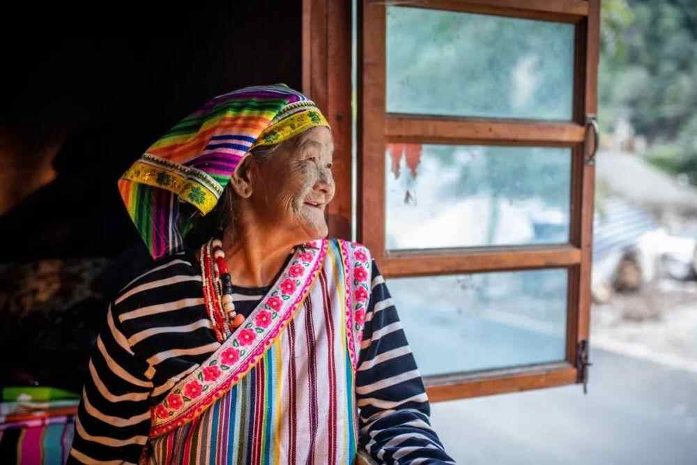 2020年10月27日,云南省贡山独龙族怒族自治县独龙江乡孔当村,独龙族“文面女”李文仕在窗边休息 胡超摄 / 本刊