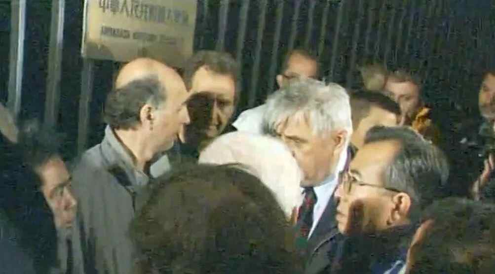 不过当时还有一个情况,政要旁边有一个争议人物:一位打遍前南各地的志愿民兵领袖——杰利科·拉兹尼亚托维奇·阿尔坎。我当时不希望他出镜,曾经一次在政要葬礼上,他就与国家高层同台被西方抓到镜头了。作为西方眼中的争议人物和犯罪分子,炸馆时他起初站在了塞总理马利扬诺维奇旁边,于是我让警方的乔维奇上校把阿尔坎挪开一点,这样我们就能有“干净”的镜头。因为我知道如果他出现在镜头里,西方媒体会故意转移话题,然后掩盖轰炸大使馆的这一罪行。