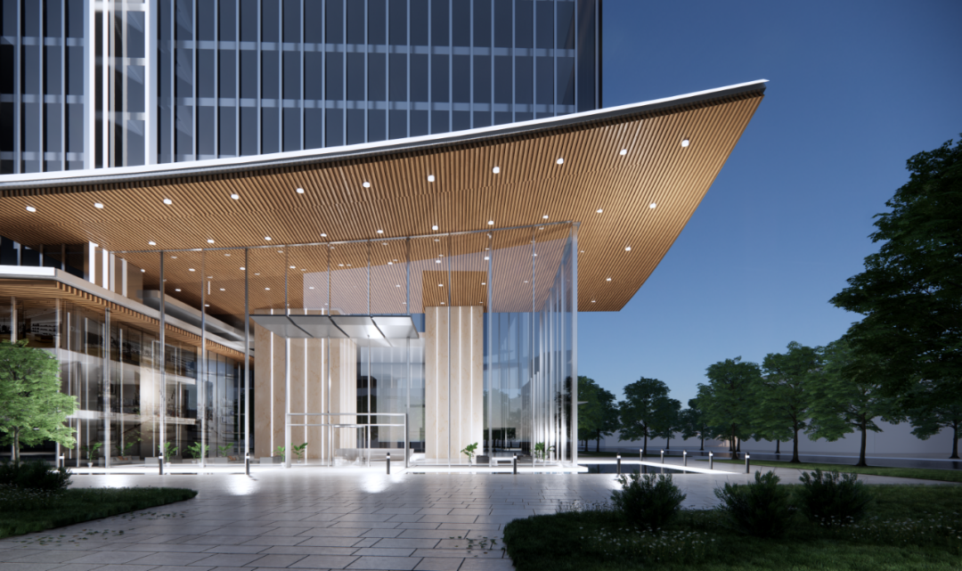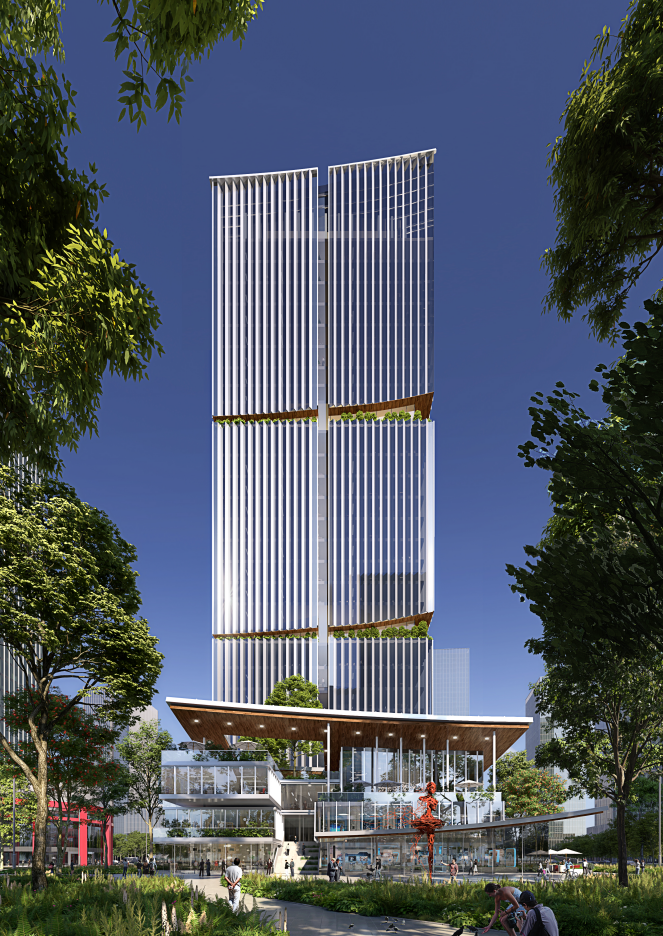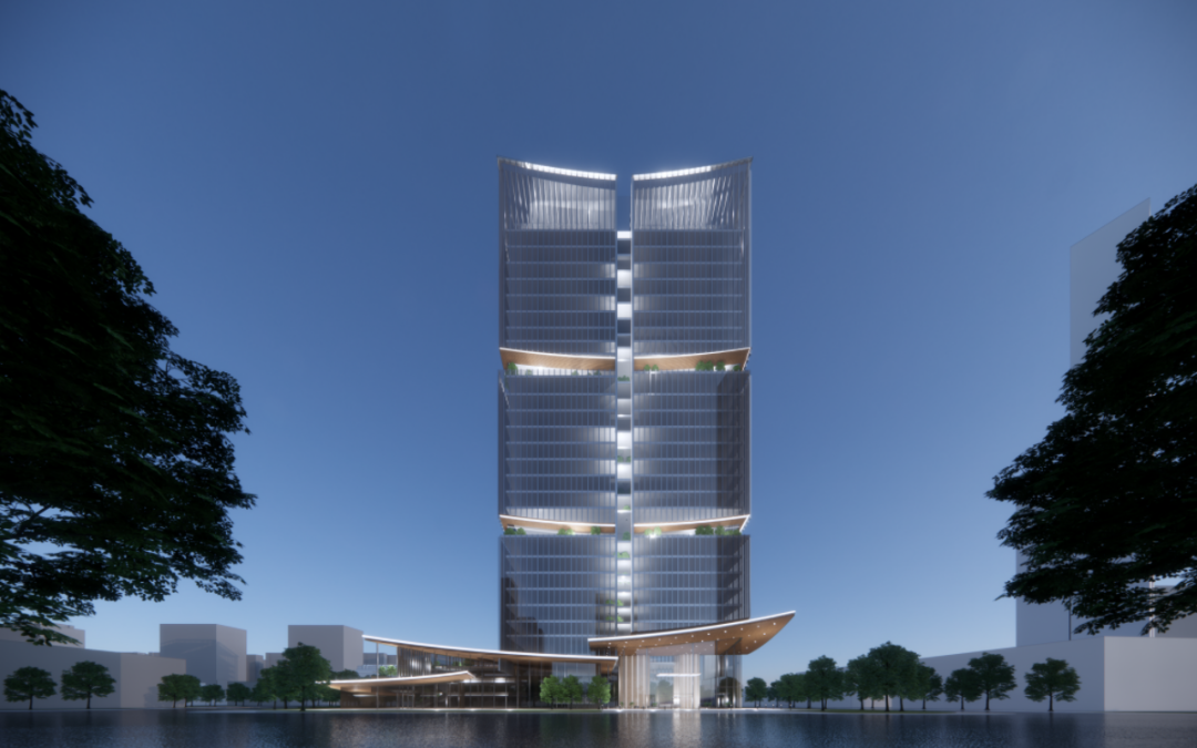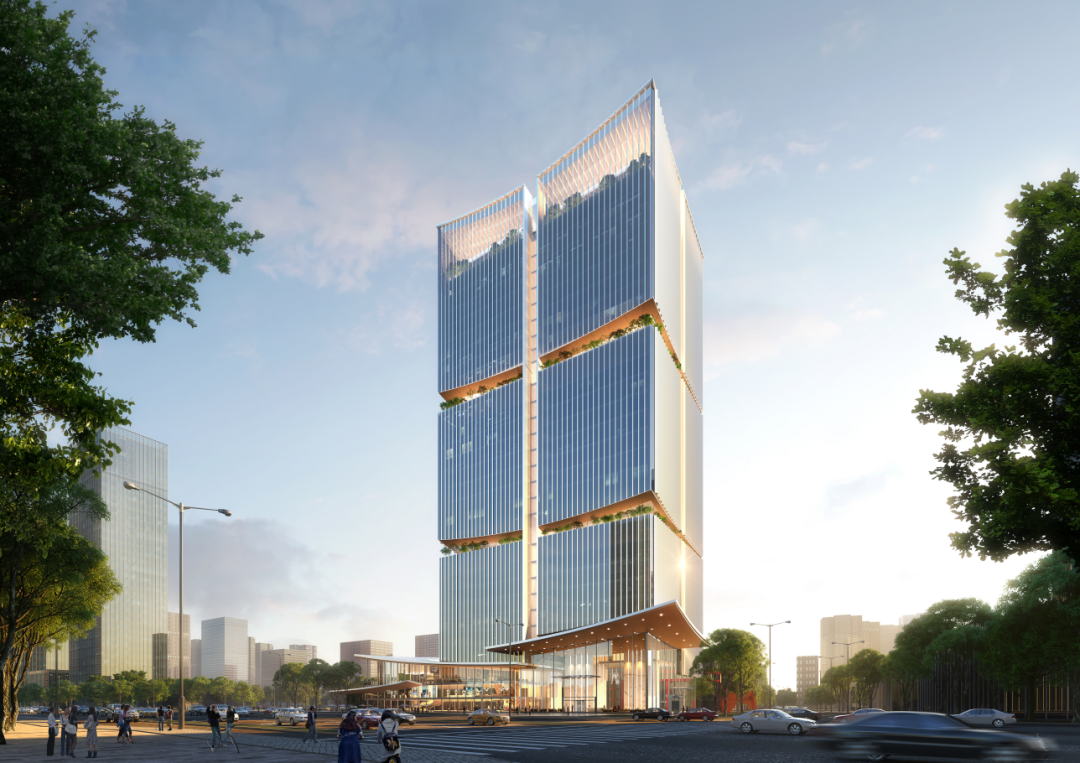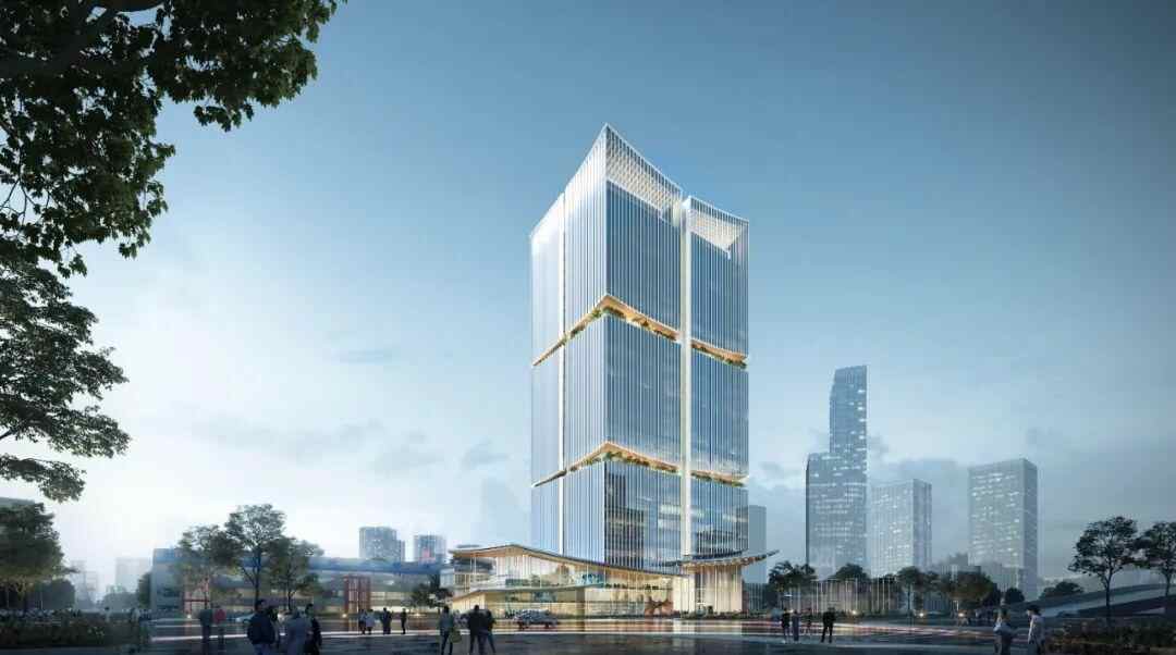 立面材质及建筑语言与金融城起步区相呼应,沿着黄埔大道一侧具有鲜明的标识性,城市界面完整。东西立面采用折面的幕墙形式,保证景观视线的同时起到较好的遮阳效果。