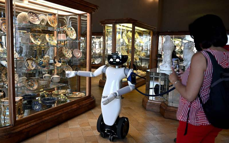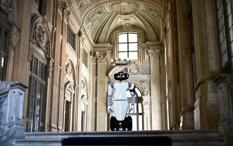 当地时间5月12日,意大利理工学院设计的人形机器人R1带领游客游览都灵马达马宫。该机器人能够描述作品,并回答有关作品作者或所属历史时期的问题。