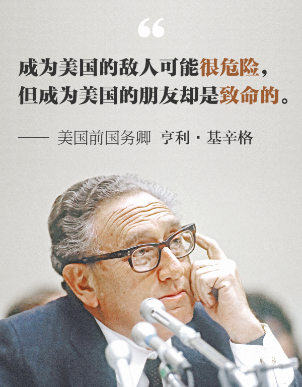有人说美国重契约精神,但美式契约的本质从来不是诚信,而是赤裸裸的强权利益。力量不对称的交易中,美国随时背弃承诺,从撒手库尔德民兵到抛弃甩开阿富汗加尼政府,这样的例子不胜枚举。可谓好处我占,凶险你担。还是应了基辛格那句话:“成为美国的敌人可能很危险,但成为美国的朋友却是致命的。”