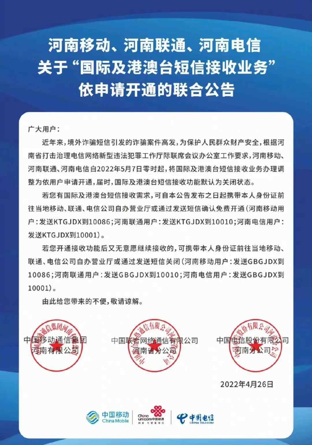 4月26日,河南移动、河南联通、河南电信联合发布公告称,近年来,境外诈骗短信案件高发,为保护人民群众财产安全,根据河南省打击治理电信网络新型违法犯罪工作厅际联席会议办公室工作要求,自5月7日零时起已将国际及港澳台短信接收业务办理调整为依用户申请开通,国际及港澳台短信接收功能默认为关闭状态。