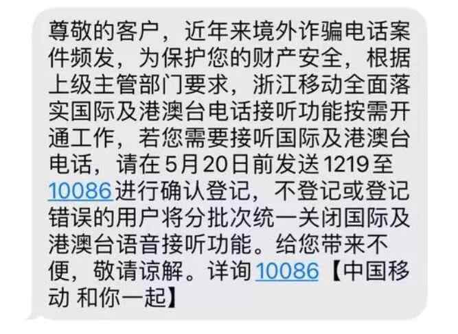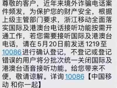 据新华社报道,中国移动浙江相关负责人回应称,此事属实,公司正通过短信形式分批次通知客户。若用户需要接听国际及港澳台电话,需发送1219至10086进行确认登记。