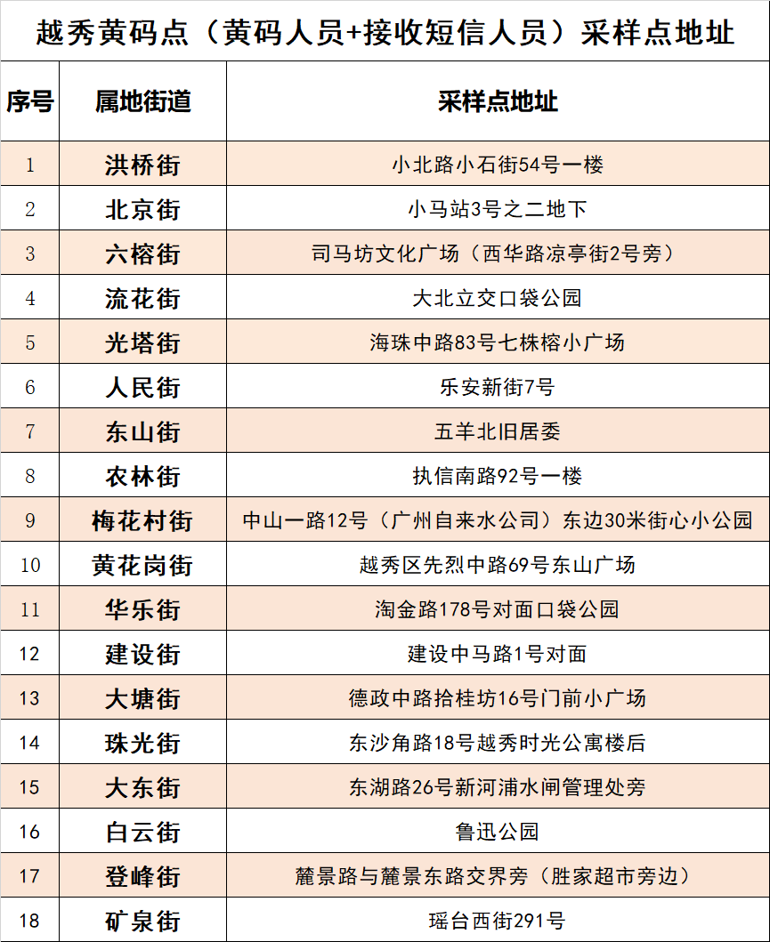 5月15日,越秀区公布18条街道核酸检测场地(黄码点位),请市民们尽快前往就近检测点检测。