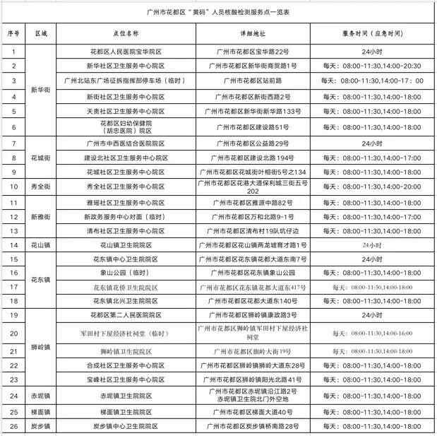 五、请持黄码以及收到短信提醒的市民朋友,到就近黄码核酸采样点进行核酸检测。(附:花都区“黄码”人员核酸检测服务点一览表)